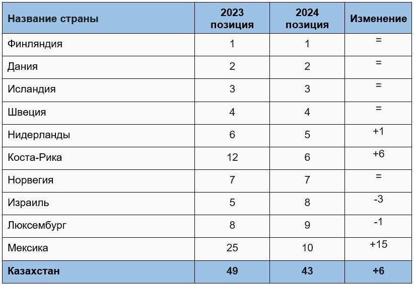 Исследовательский центр благополучия Оксфордского университета, компания Gallup и Сеть по выработке решений в области устойчивого развития ООН ежегодно публикуют Всемирный доклад о счастье (World Happiness Report). Недавно были опубликованы данные за 2024 год, согласно которым, Казахстан улучшил свои позиции в рейтинге счастья с 49 места до 43.