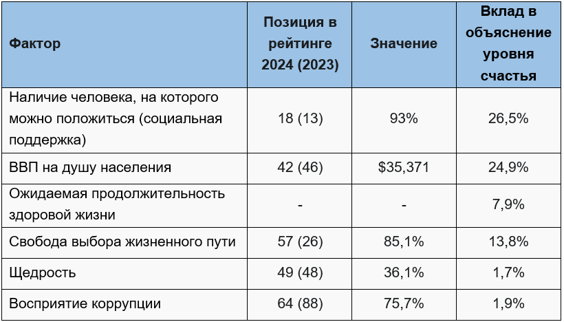 Например, для Казахстана значительная часть общего уровня счастья объясняется через важную роль социальной поддержки (наличие человека, на которого можно положиться) и уровня доходов (ВВП на душу), а свобода выбора, здоровье и восприятие коррупции вносят меньший вклад. По сравнению с прошлым годом (2023), Казахстан улучшил свои позиции в рейтинге только по двум факторам – ВВП и оценка восприятия коррупции, по остальным ситуация ухудшилась, особенно в части свободы выбора.