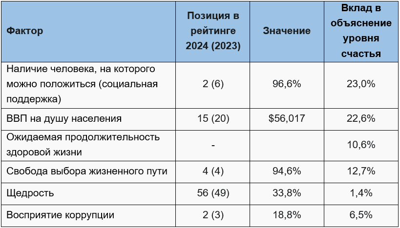 Для сравнения, в Финляндии, которая в рейтинге уже несколько лет занимает 1 место, также наибольший вклад в объяснение счастья вносит социальная поддержка (23%) и ВВП (22,6%), но сами значения показателей заметно лучше, чем в других странах: выше значение ВВП и уровня социальной поддержки, меньше коррупции, больше свободы выбора в жизни. При этом стоит подчеркнуть, что Финляндия занимает 1 место в рейтинге счастья, но по уровню ВВП на душу населения она на 15 месте, это яркий пример того, что счастье не растет пропорционально доходу.