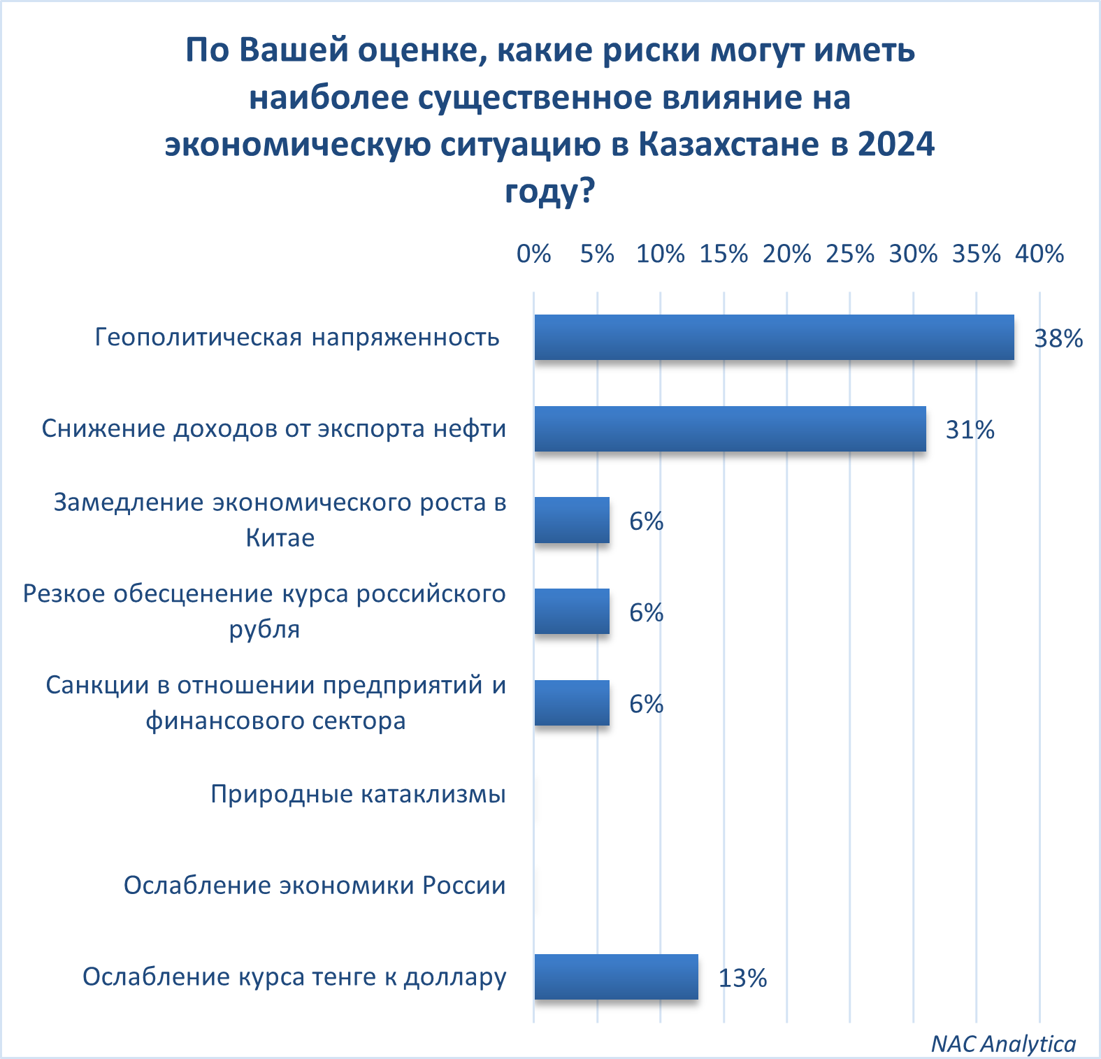 Среди ключевых рисков, способных оказать наибольшее влияние на экономику Казахстана, на первом месте оказались геополитическая напряженность и снижение доходов от экспорта нефти. Также были отмечены такие риски, как ослабление курса тенге и последствия санкций.
