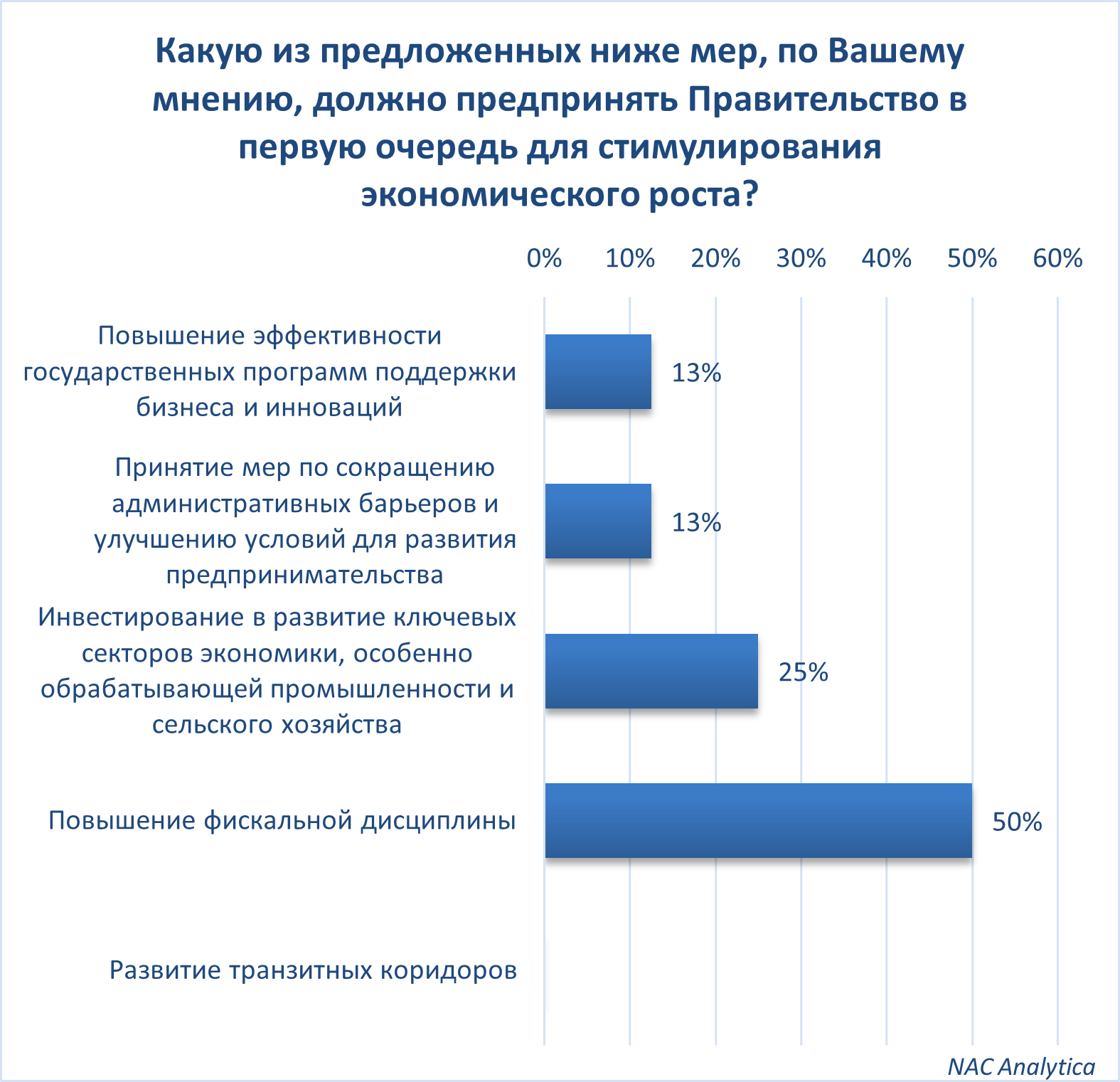 Что касается первоочередных мер для стимулирования роста, 50% экспертов считают, что наиболее актуальной является повышение фискальной дисциплины. 25% акцентировали внимание на инвестировании в ключевые сектора экономики, такие как обрабатывающая промышленность и сельское хозяйство. Улучшение условий для предпринимательства и сокращение административных барьеров указали 12,5% респондентов.
