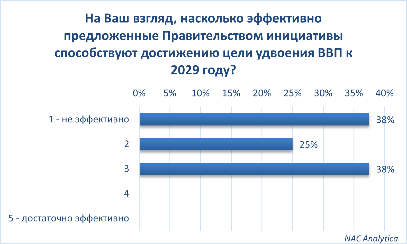 Эффективность правительственных инициатив по удвоению ВВП к 2029 году была оценена довольно критично. 38% опрошенных считают текущие меры неэффективными, еще 25% склоняются к мнению, что они «скорее неэффективны». Остальные заняли более нейтральную позицию.